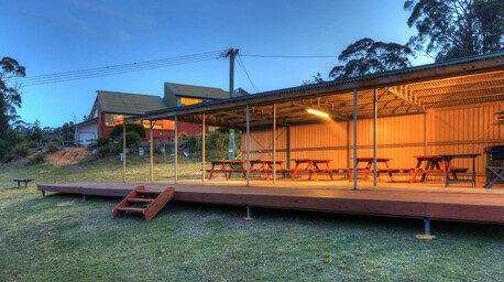 This area enjoys all day sun and runs down the side of the basket-ball court. A great place to enjoy your meals or just sit and chat en-joying the warmth of the sun and the beauty of the Tasmanian countryside.