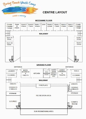 The centre sleeps 106 people in 17 rooms . Fourteen rooms are situated off the Mezzanine Floor over-looking the Recreation/Sunroom Area. Twelve of these rooms consist of bunks, eight sleeping eight people each, two sleeping seven people each and two sleeping five people each. All rooms have a wash basin and mirror.